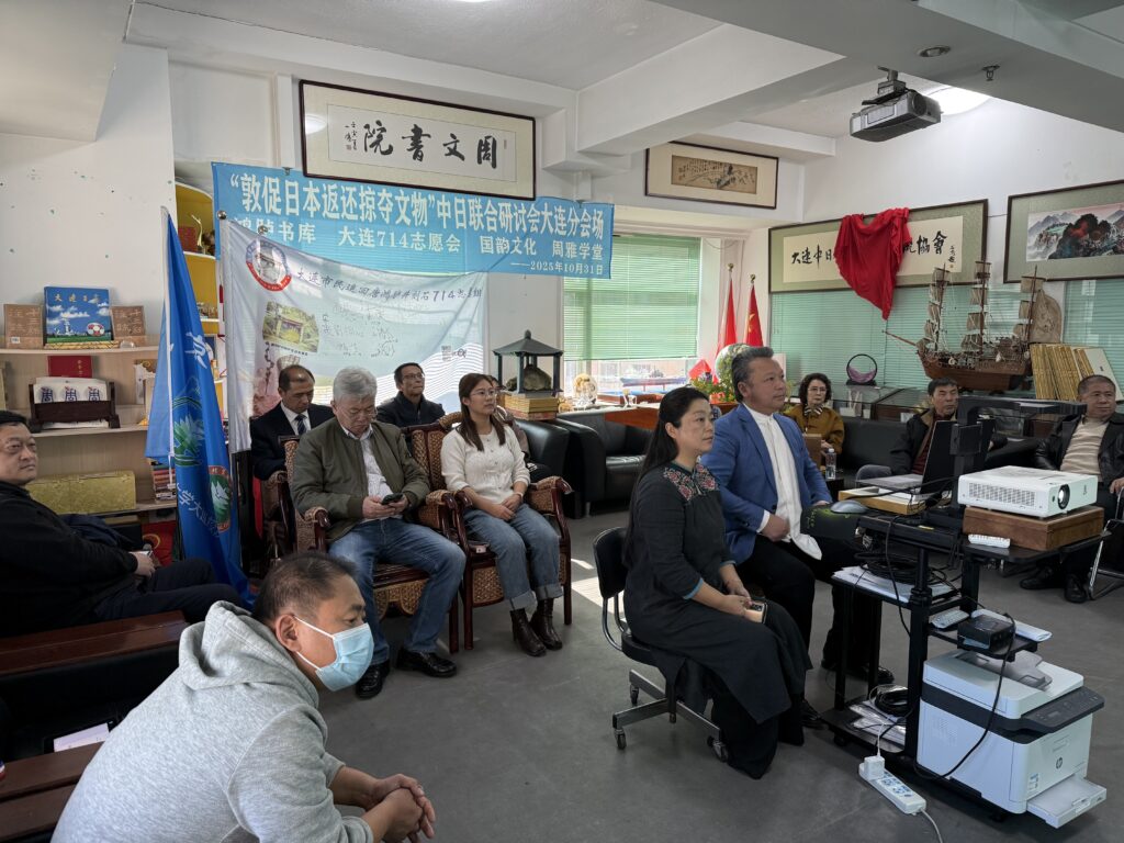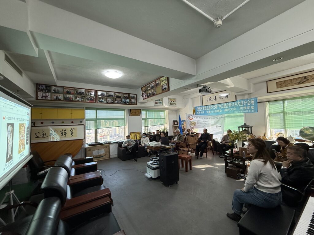 大連714志願会の姫巍氏は、新に発見された日清戦争後に日本へ流出した文物:金州城北門の扉(金州鎧門)、海城市の4つの城門の扁額、大連湾和尚島中砲台の扁額、旅順の老蛎嘴にあった「東方震出」の石額、旅順の北洋水師海軍公所にあった扁額及び山東省威海市の劉公島北洋海軍公所門前にあった旗竿を紹介しました。